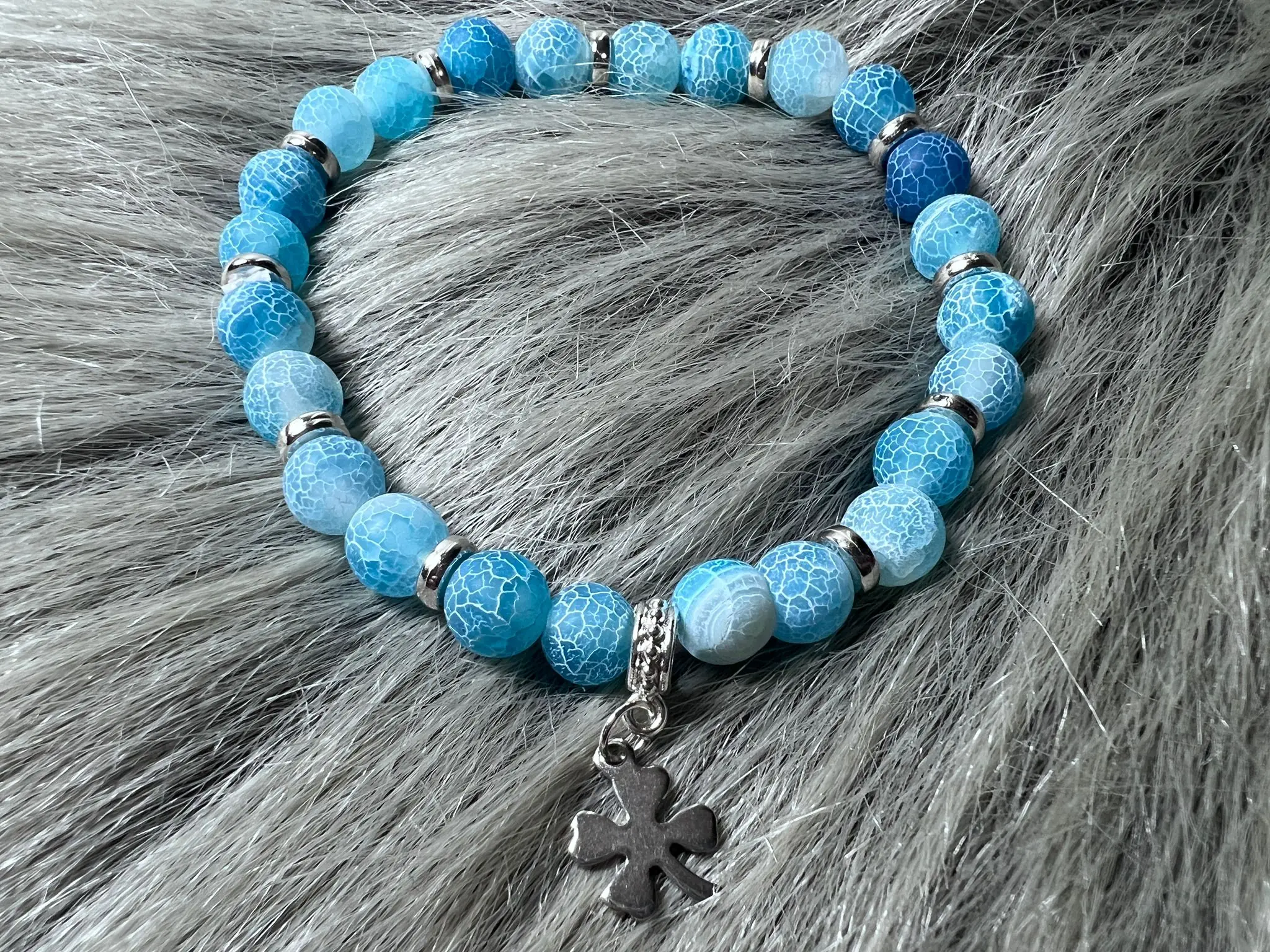 Náramek s modrými korálky a čtyřlístkem 🍀